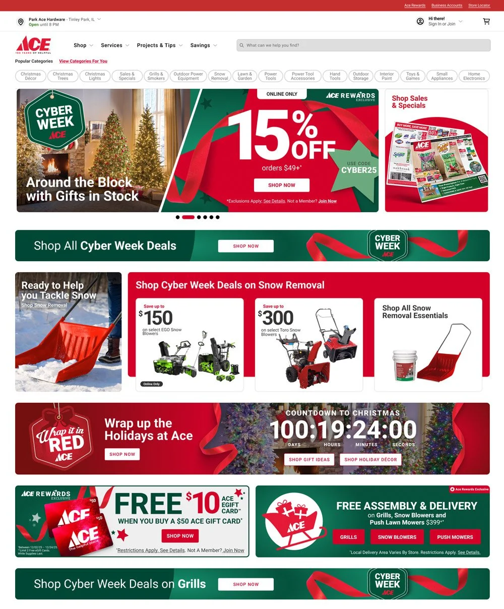 Ace Hardware's holiday creative theme is a constant — the warmth and familiar Helpful Hardware folks. The challenge was evolving the visual language for 2025: bringing a more modern, design-forward aesthetic to a brand with deep equity, without losing the seasonal warmth that customers expect.